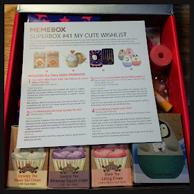 I opened it up to find that I had recieved Superbox 41: My Cute Wishlist! As a huge fan of cute packaging and products, I was overjoyed. Here's how Memebox describes this box!