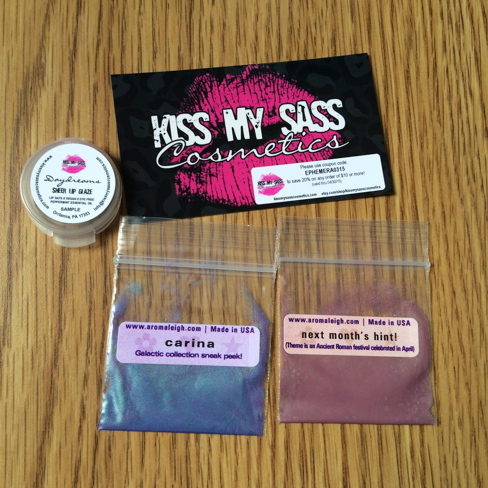 And, she's also included a lip gloss sample from Kiss My Sass Cosmetics. The sample is a sheer gloss with a pink sheen. It is cute and will be great to liven up a too-matte lipstick! I love that she's managed to send a sample from another indie company each month...such a nice touch!